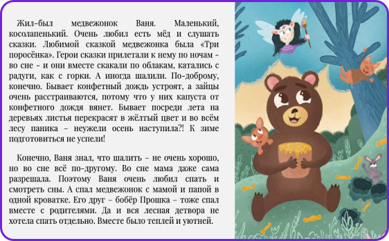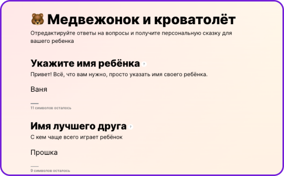 В нашем сервисе вы найдете: - 22 развивающие сказкив которых можно менять переменные. - Ежемесячно новые сказки. - Выбор картинокк сказкам. - Озвучкуи музыкальное сопровождение. - Оригинальный сюжеткаждой сказки, написанный детским психологом. - Заботливый сервис.