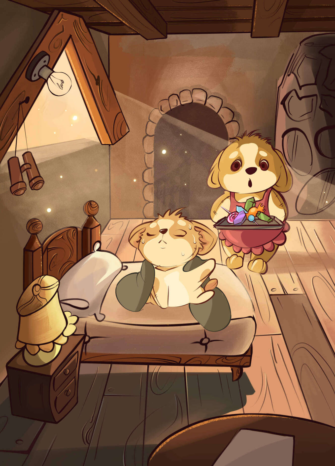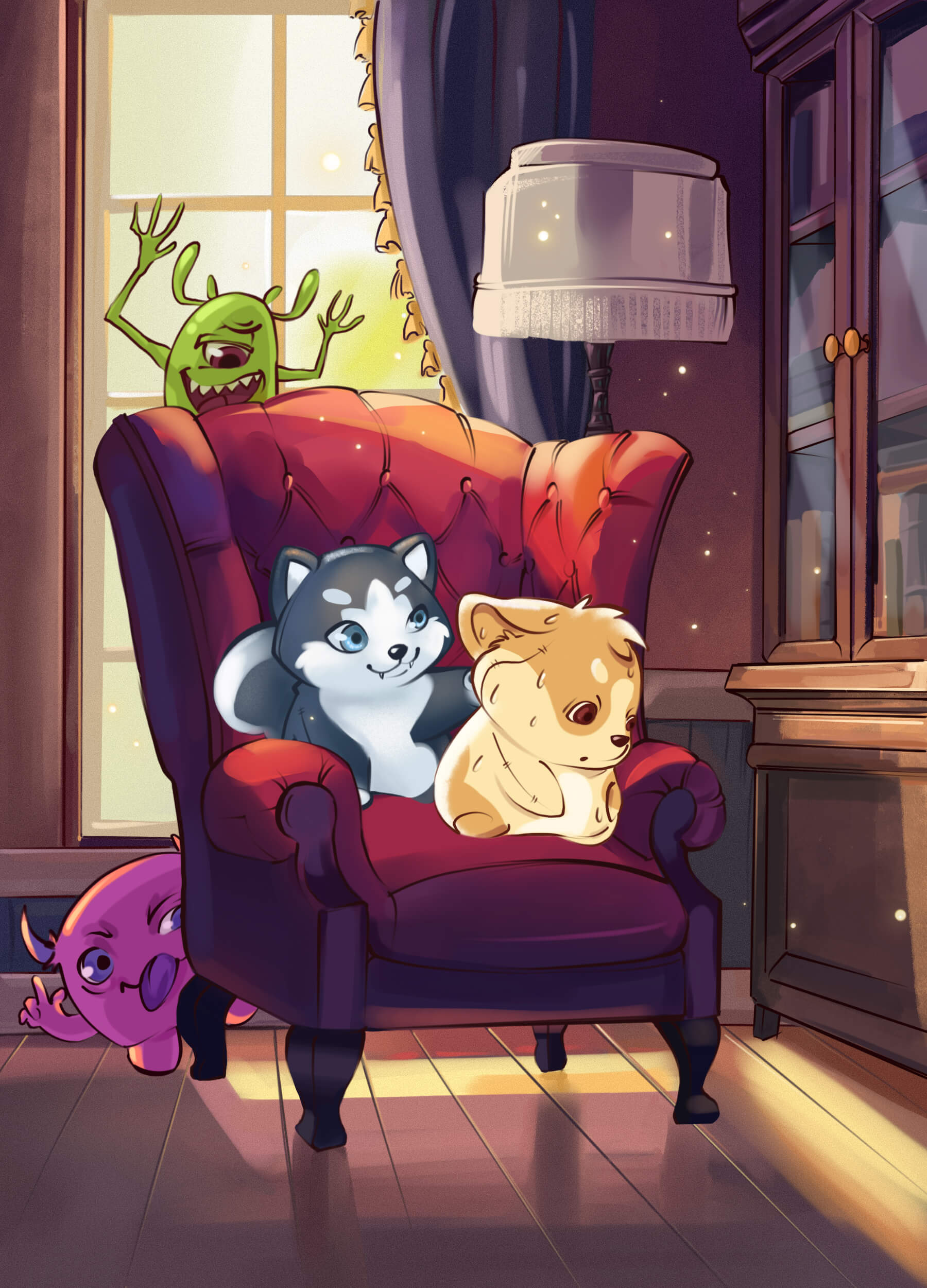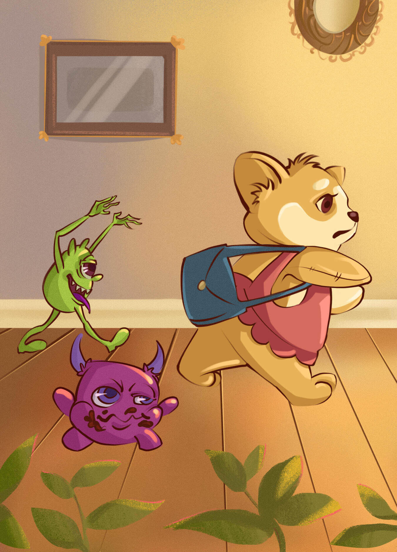 Доктор достал из своего чемоданчика мерцающий порошок, подкинул в воздух. Сначала порошок повис облачком, а после осыпался на все предметы в комнате. О, чудо! Благодаря волшебному порошку Вирус, Микроб и Бактерия стали видны. Эти маленькие хулиганы сидели на краю кровати щенка. Бактерия играла с любимым мячиком щенка, а двое других дожёвывали конфеты. Вирус был толстым и неуклюжим – видимо, на конфетах отъелся. Бактерия - конопатая, с растрёпанными косичками, а микроб маленький зелёный и ворчливый.