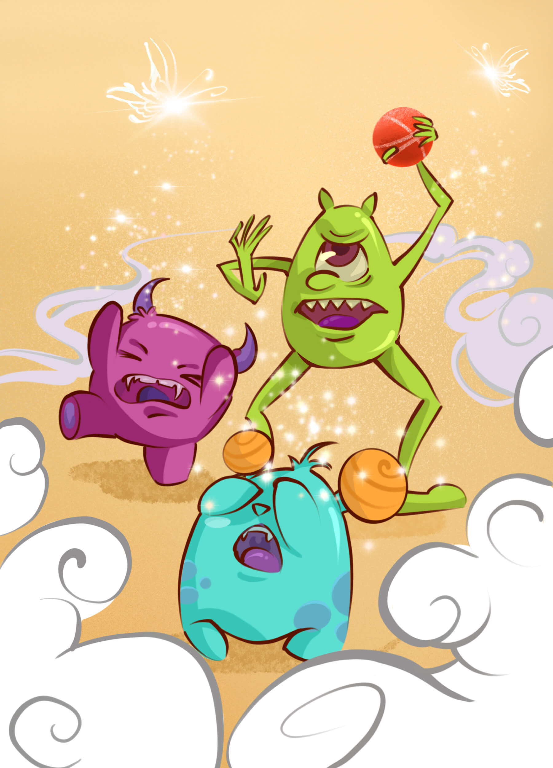 В надежде укрыться от чар добрый феечек, хулиганы кинулись в тапок щенка. Но малышки-феи взмахнули волшебными палочками – тапок взлетел и вместе Вирусом, Бактерией и Микробом вылетел в окно. Бактерия хотела прихватить с собой мячик, но он не поместился в оконную раму. Так и улетели хулиганы, а любимая игрушка щенка снова вернулась к нему.
