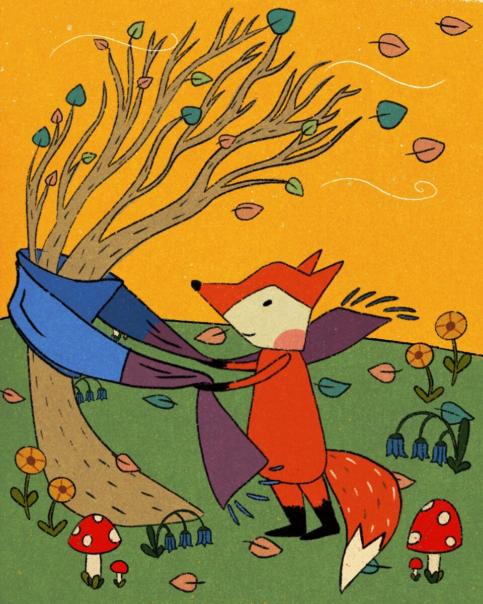 Лисёнок обматывал осину шарфиком, приклеивал «хвостики» на клей. Но как только пошёл дождь, листья снова опали. С каждым днём их становилось всё меньше. Мама сказала, что скоро опадут оставшиеся листья, а снег перекрасит лес в цвет заячьей шубки.