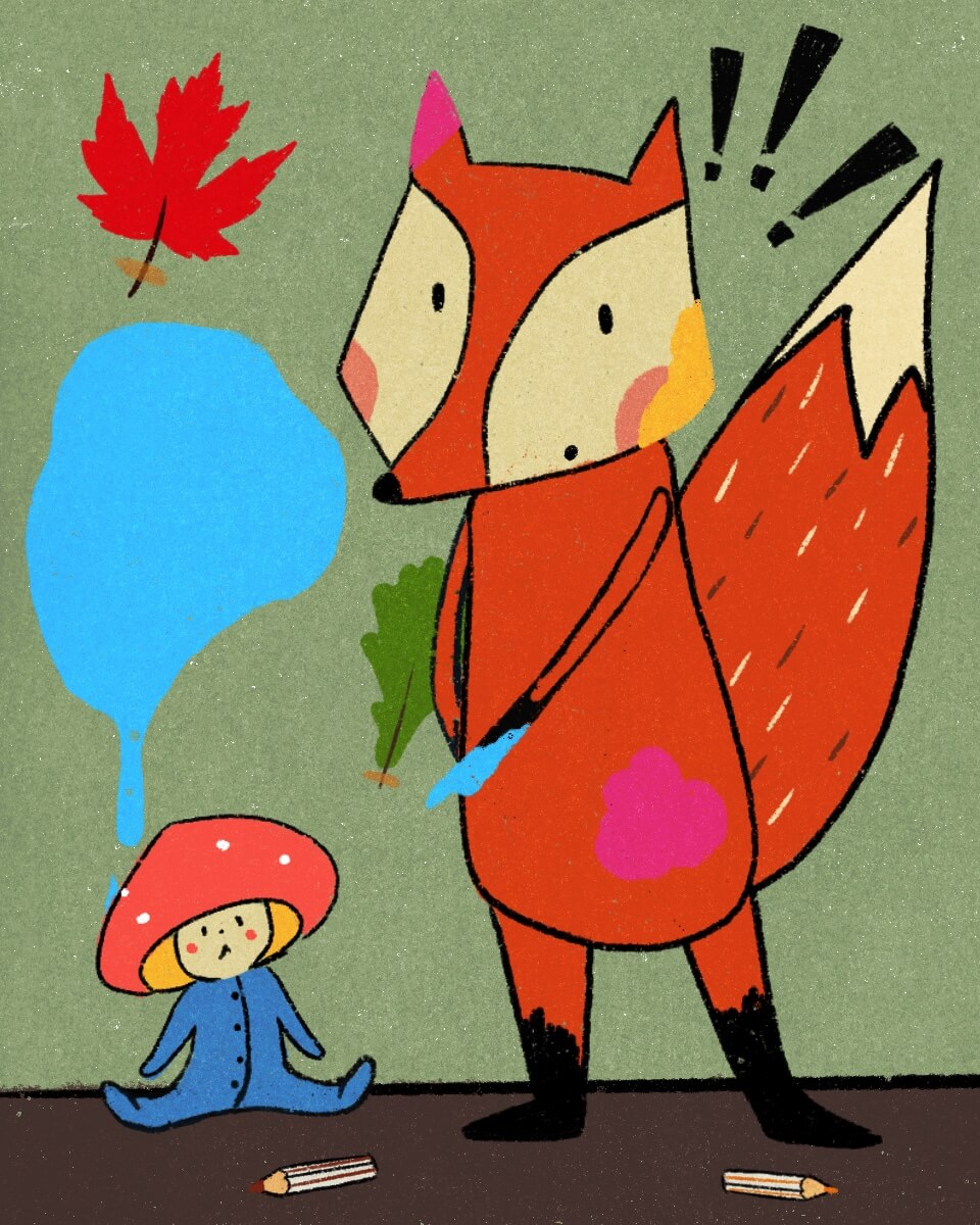 Лисёнку стало грустно. Чтобы любоваться «лисьими хвостиками» даже зимой, он решил нарисовать осину на бумаге и повесить в своей комнате. Взял краски. Посадил на стол лесовичка. Но едва взмахнул кисточкой, случилась неприятность. Лисёнок нечаянно опрокинул краски. Большие разноцветные пятна расплылись на обоях. Услышав шум, в комнату вошла мама, увидела перепачканные стены и спросила: