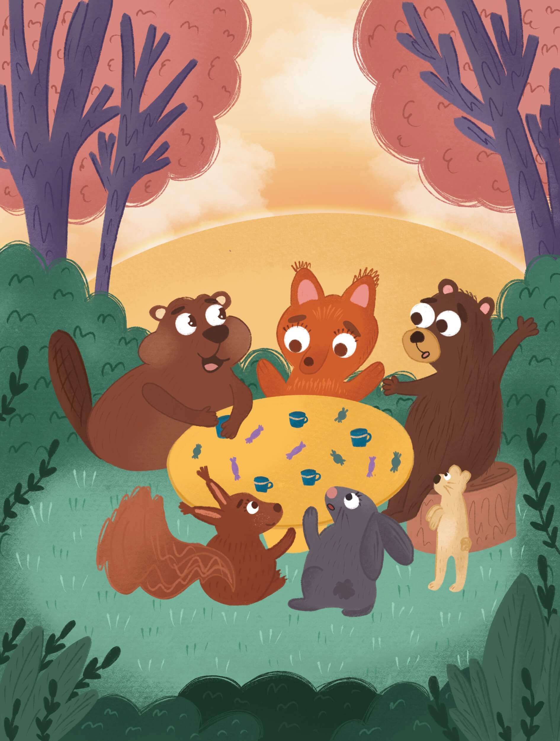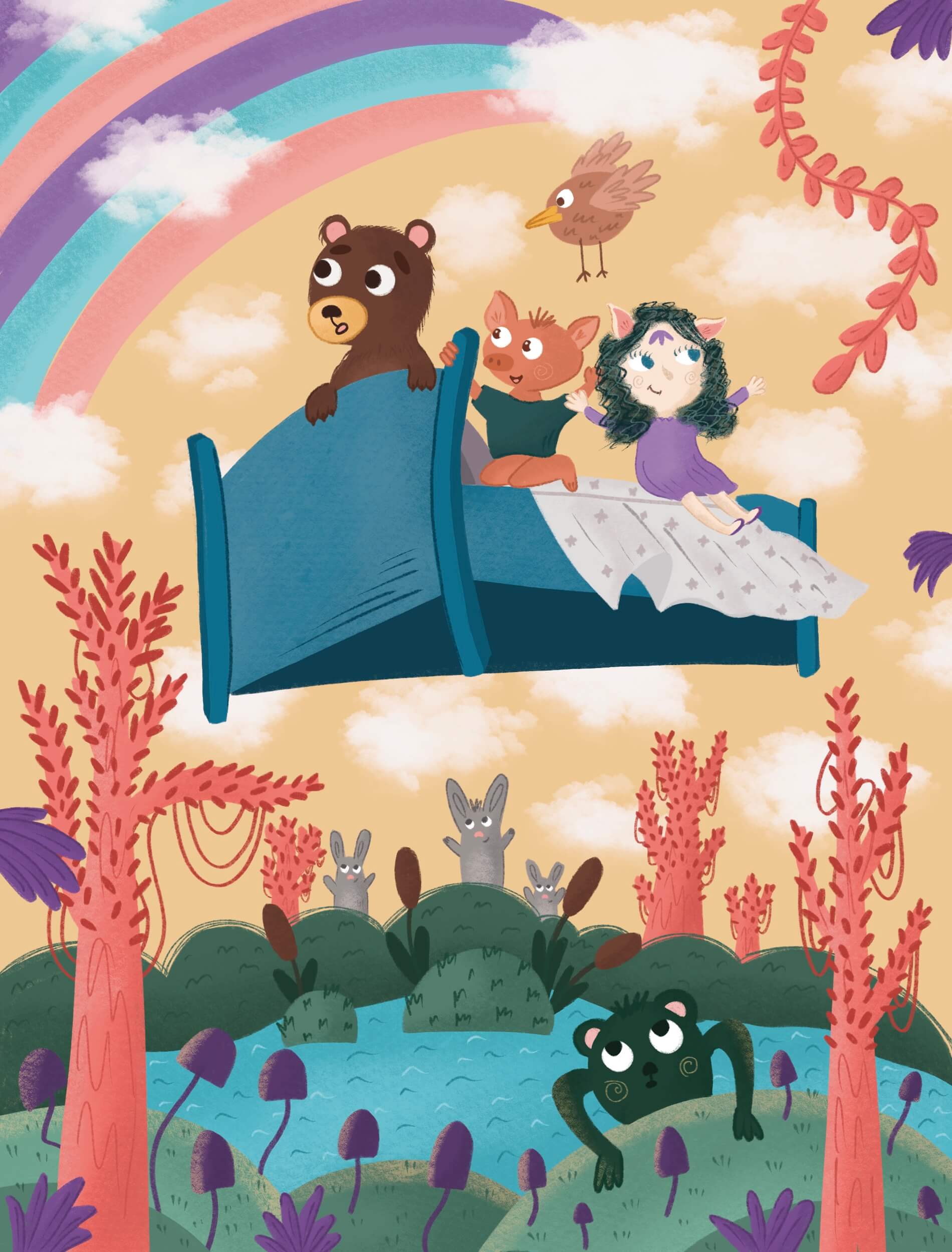 Шлемов под рукой не оказалось, но и кастрюли отлично подошли. Днём к медвежонку пришёл его друг – бобёр Рома и тоже попросил покатать его на кроватолёте. А к вечеру вся лесная детвора уже знала про кроватолёт медвежонка и просила родителей купить им такой же – для ночных путешествий во сне.