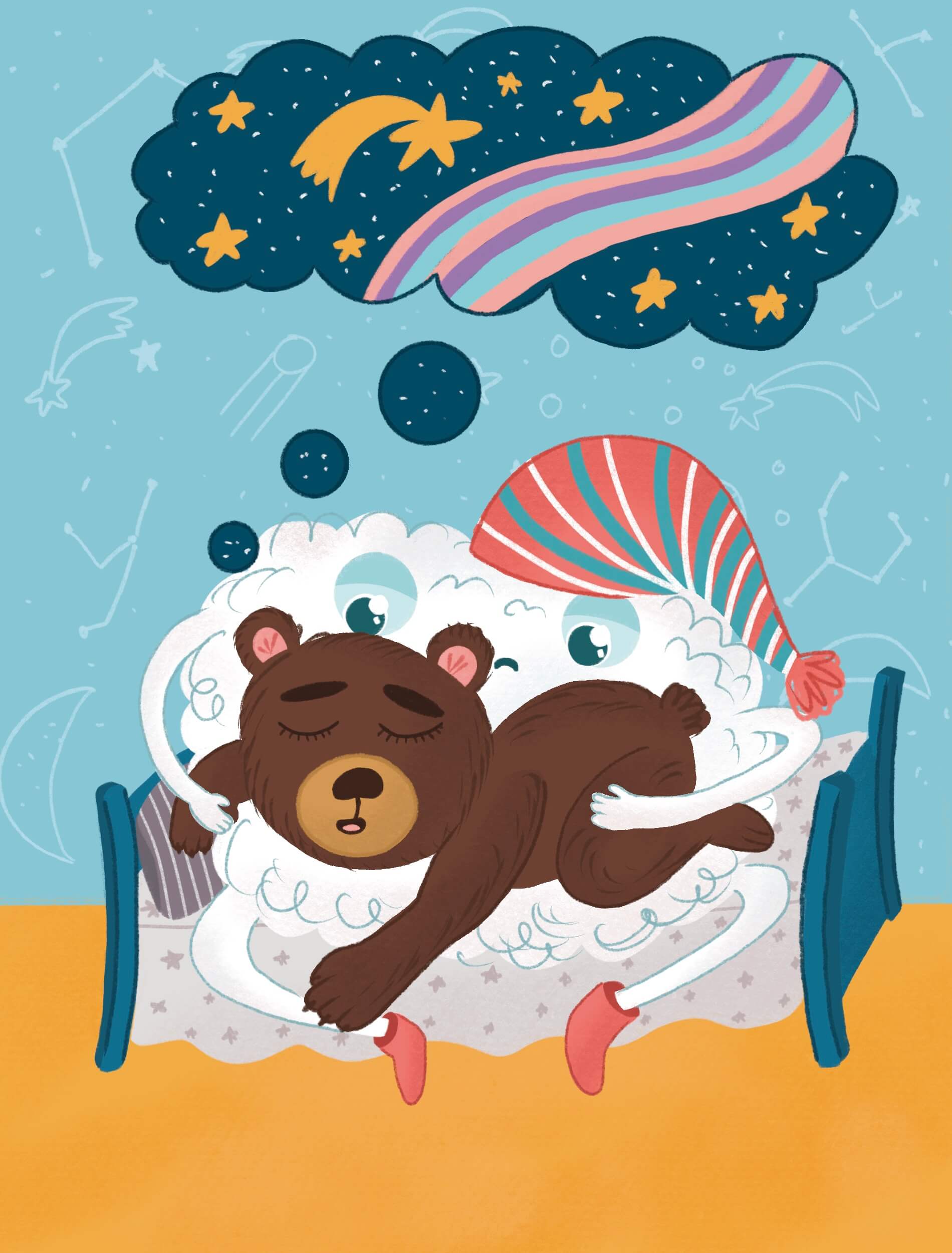 Пока Ваня успокаивал сонное облачко, не заметил, как сам уснул. Облачко укутало медвежонка, как пуховым одеялом. А во сне медвежонка снова встретили герои его любимой сказки Теремок:
